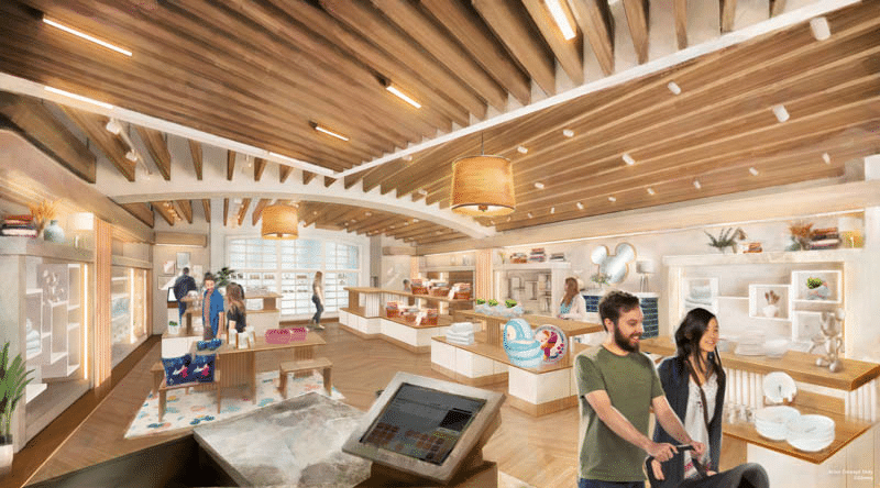 Ein völlig neues Einkaufserlebnis steht im Mittelpunkt der bevorstehenden Transformation von Disney Village. Die zu renovierenden Geschäfte, darunter Disney Fashion, Disney Fashion Junior und The Disney Gallery, werden mit großen Fensterfronten ausgestattet und komplett umgebaut, um Platz für neue, moderne Shop-Konzepte zu schaffen. Der zeitgemäße und einladende Stil kombiniert natürliche Materialien wie Holz, Ziegel und Metall, um ein dynamisches und stimmiges Gesamtbild zu erzeugen. Dieses Design sorgt nicht nur für eine frische Optik, sondern bietet den Besuchern auch ein verbessertes Einkaufserlebnis, bei dem Funktionalität (wie teilweise überdachte Bereiche zum Schutz vor Regen) und Ästhetik, insbesondere durch die Verwendung von Disney-Fassaden, Hand in Hand gehen. Lassen wir uns einmal anschauen, wie die Zukunft für einige der Geschäfte und Restaurants aussehen wird.